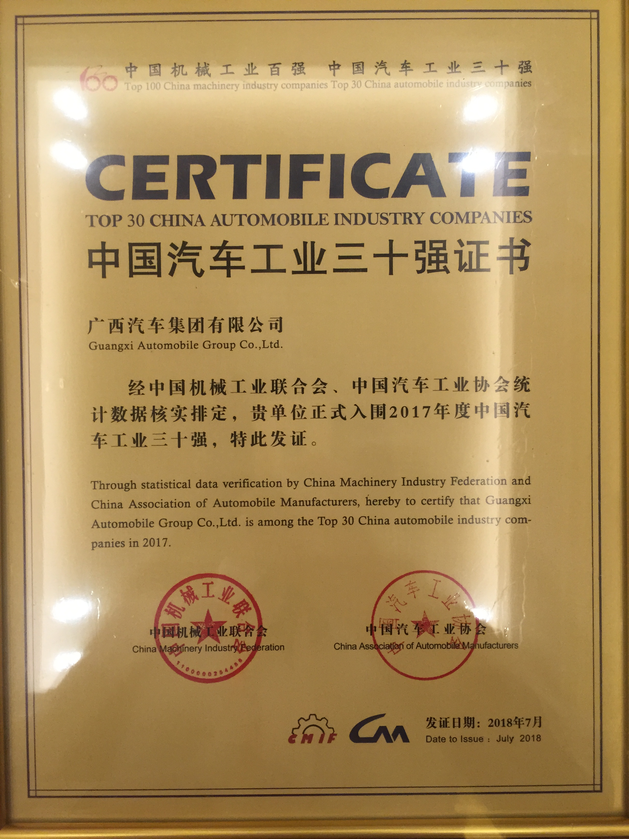 2018713日,由中國(guó)機(jī)械工業(yè)聯(lián)合會(huì)、中國(guó)汽車工業(yè)協(xié)會(huì)聯(lián)合組織開展的“2017年中國(guó)機(jī)械工業(yè)百?gòu)?qiáng)企業(yè)、汽車工業(yè)30強(qiáng)企業(yè)”榜單揭曉并正式向社會(huì)發(fā)布,廣西汽車集團(tuán)公司以2017年度營(yíng)業(yè)收入220億元榮登“2017中國(guó)汽車工業(yè)30強(qiáng)企業(yè)”榜單,排名第21位,集團(tuán)已連續(xù)10年躋身“中國(guó)汽車工業(yè)30強(qiáng)企業(yè)”行列。