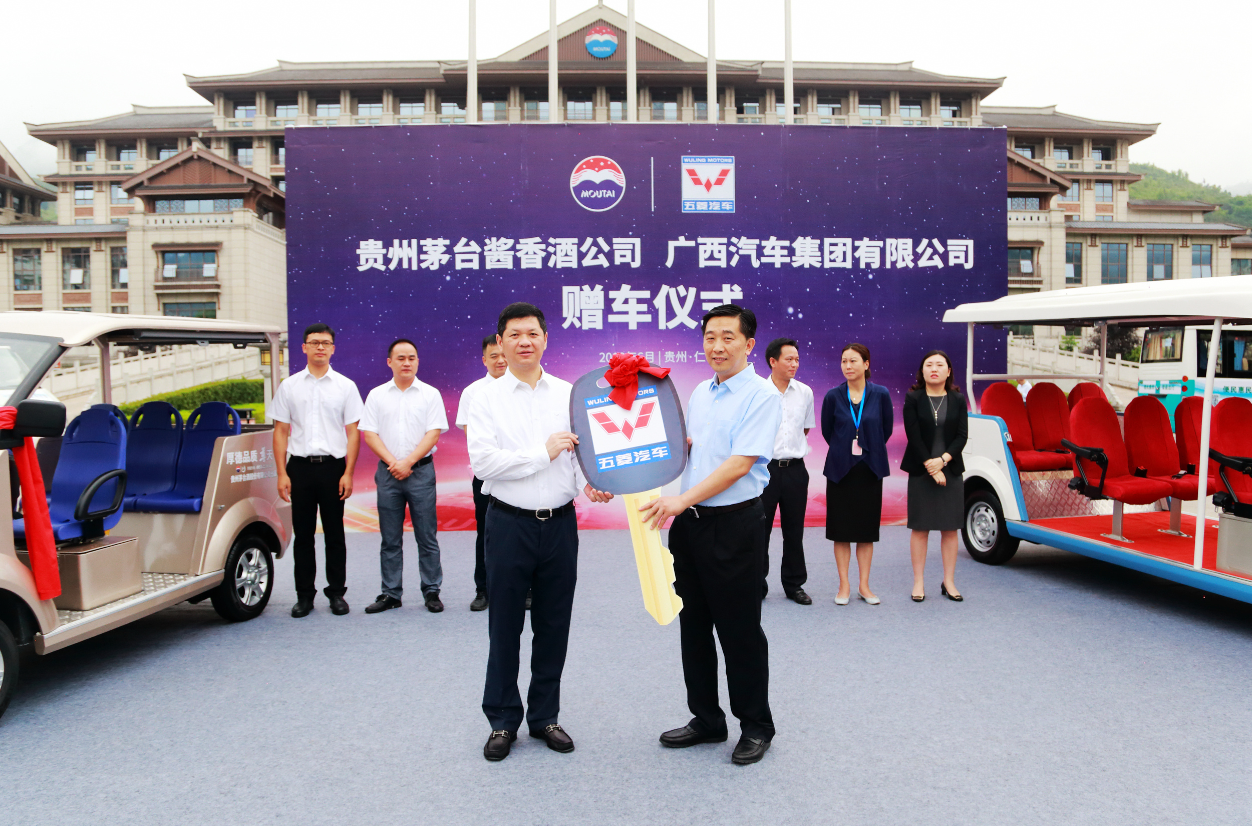 6月22日,廣西汽車集團(tuán)將兩款觀光車正式贈予茅臺醬香酒公司(簡稱茅臺),交接儀式在遵義舉行。該觀光車為茅臺專屬全新定制,肩負(fù)兩個跨界行業(yè)領(lǐng)先品牌“神車+神酒”的重要合作意義。廣西汽車集團(tuán)總裁、五菱工業(yè)公司總經(jīng)理袁智軍、廣西汽車集團(tuán)副總裁、五菱工業(yè)公司副總經(jīng)理陳曉峰、貴州茅臺酒股份有限公司副總經(jīng)理、醬香酒公司董事長李明燦、醬香酒公司副總經(jīng)理張旭等出席儀式。
