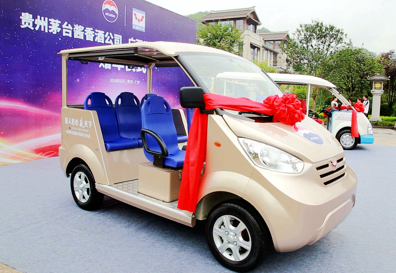 為進(jìn)一步加深與茅臺醬香酒的合作,廣西汽車集團(tuán)專屬定制2款經(jīng)典五菱觀光車贈送茅臺醬香酒公司,在其廠區(qū)內(nèi)使用。其中一款五菱威威觀光車,全國50%以上5A級景區(qū)在用,也是2017年“一帶一路”高峰論壇故宮接待國賓的唯一指定觀光用車。另一款為五菱電動觀光車,是一款可選裝鋰電池的新能源車,適用于景區(qū)觀光、社區(qū)公交、共享租賃等,此次更是結(jié)合了茅臺醬香酒的金色和企業(yè)LOGO特別定制。