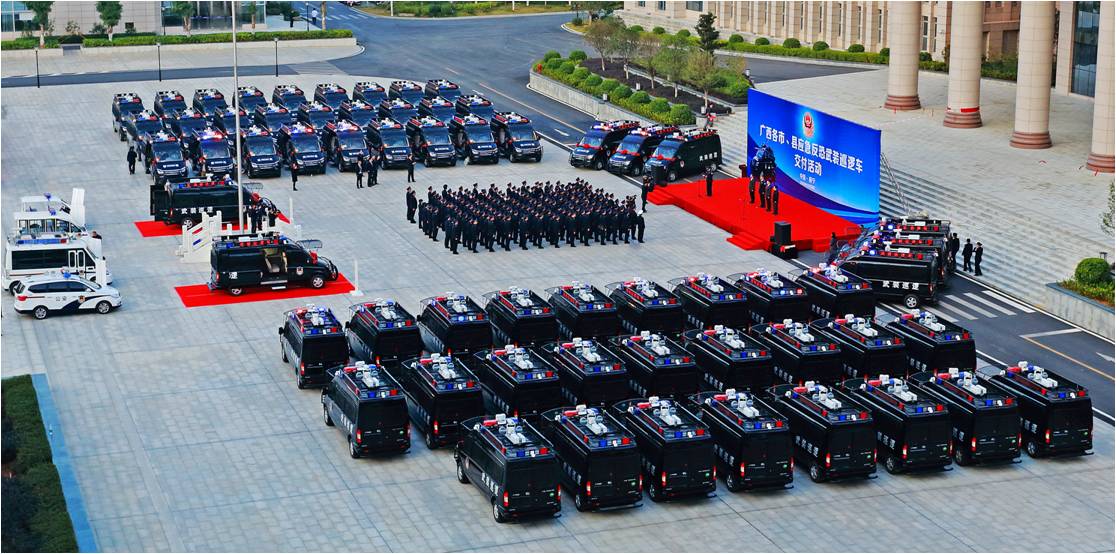 這批反恐武裝巡邏車是公司根據(jù)廣西全區(qū)反恐實(shí)戰(zhàn)需求和區(qū)域特點(diǎn),研發(fā)生產(chǎn)的全新一代五菱V80特種專用警務(wù)產(chǎn)品。每輛應(yīng)急反恐武裝巡邏車能滿足5-6個(gè)警員攜帶裝備執(zhí)行出警和應(yīng)急處突任務(wù),整車安裝有防護(hù)網(wǎng),前撞擊桿,后防護(hù)桿,可清除一般性障礙,撞擊作案車輛,具有強(qiáng)悍的防暴制暴和突擊能力及穩(wěn)固的自我防護(hù)能力等特點(diǎn)。同時(shí),該車還配備有全方位星光級(jí)夜視車載智能監(jiān)控系統(tǒng)、升降式強(qiáng)光照明燈、公安網(wǎng)移動(dòng)上網(wǎng)本及多形態(tài)電源供給系統(tǒng),可與各級(jí)公安監(jiān)控指揮中心實(shí)時(shí)聯(lián)絡(luò),即使在極端惡劣條件下,均可啟動(dòng)全方位監(jiān)控及語音通訊功能,通過